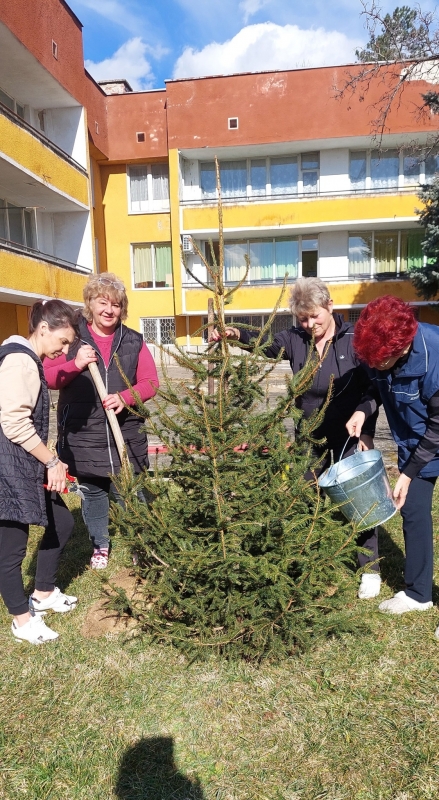 Малчуганите помагаха с голям ентусиазъм в засаждането и поливането, като обещаха отговорно да се грижат за него, за да може то да расте и краси двора на детската градина дълги години.
