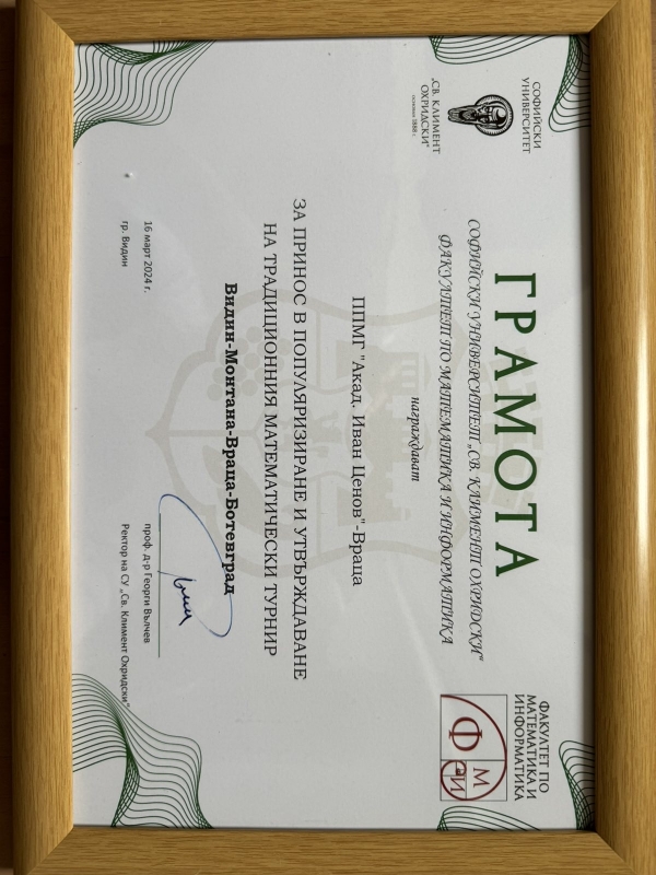 По покана на ППМГ “Екзарх Антим I“, гости на събитието по награждаването на участниците в математическия турнир Видин-Враца-Монтана-Ботевград в културен център „Жул Паскин“, беше ректорът на Софийския университет „Св. Климент Охридски“ - проф. доктор Георги Вълчев, доц. доктор Първан Първанов - зам. ректор на Софийския университет, проф. доктор Мая Стоянова - декан на Факултета по математика и информатика към Софийския университет.