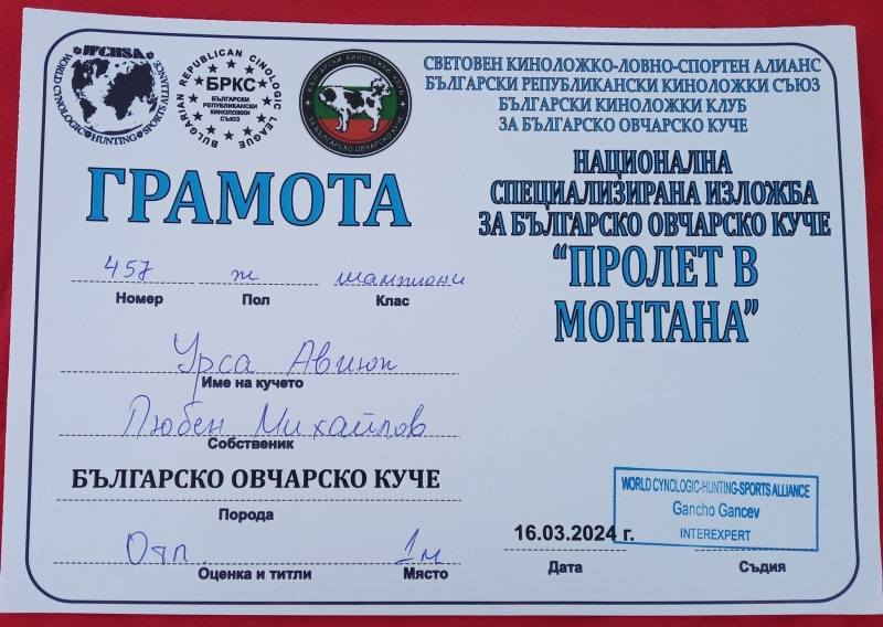 В проведената национална специализирана киноложка изложба „Пролет в Монтана“ участваха членовете от клуба за Българско овчарско куче в Берковица Пламен Ерменков, Любен Михайлов, Борислав Михайлов и Цветелина Михайлова с техните кучета Урса „Авиюп“ в клас Шампиони и Атина „Авиюп“ в клас Ветерани.