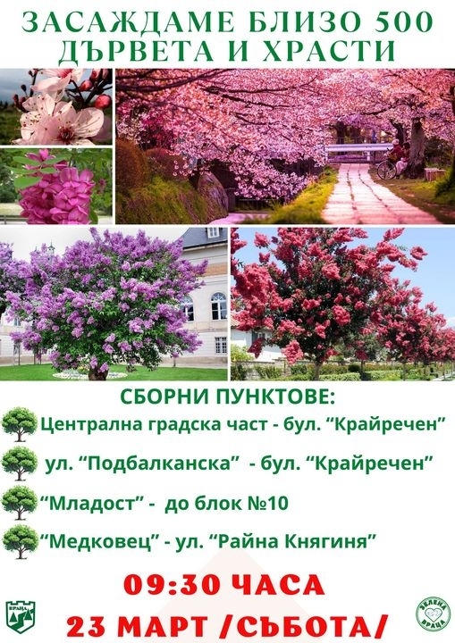 Тази събота /23 март/ ще се проведе втората инициатива от кампанията "Зелена Враца". В кварталите "Младост" и "Медковец", Централна градска част и в района на ул. "Подбалканска" ще бъдат засадени близо 500 дървета и храсти от видовете - розова акация, японска дюля, индийски люляк и японска вишна.