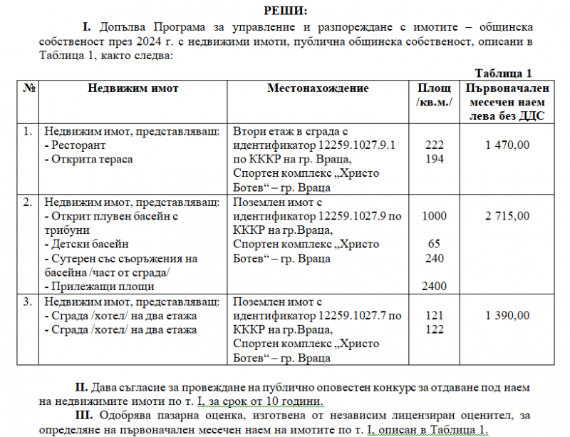 В галерията по-долу, може да видите таблицата с недвижимия имот, неговото местонахождение, площта му, както и какъв е обявеният първоначален месечен наем лева без ДДС.