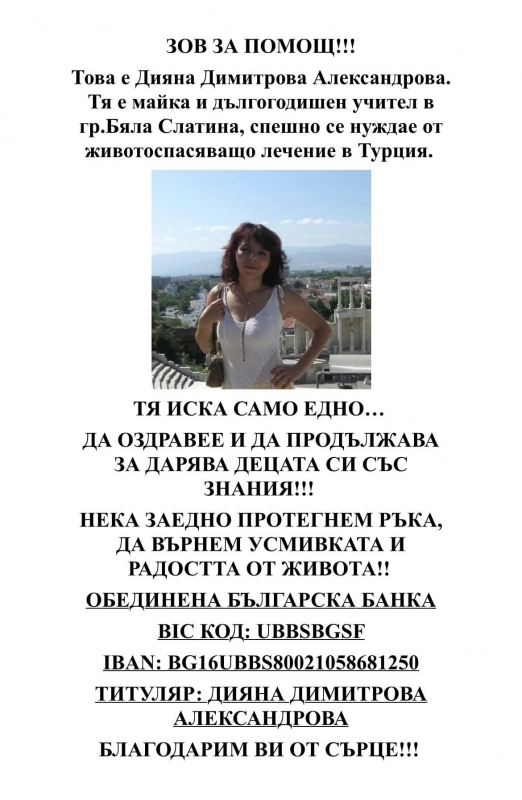Дългогодишна учителка в Бяла Слатина има нужда от подкрепа, за да оздравее. Дияна Александрова се бори с тежко онкологично заболяване и в момента е в Турция.
