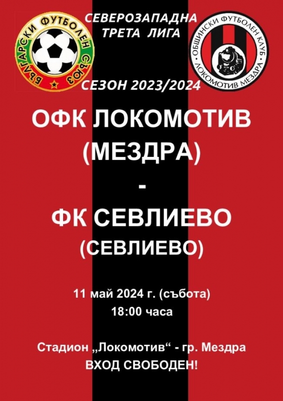 заповядайте на футболната среща от 27-ия кръг на първенството в Северозападната Трета лига между отборите на ОФК Локомотив (Мездра) и на ФК Севлиево (Севлиево)!