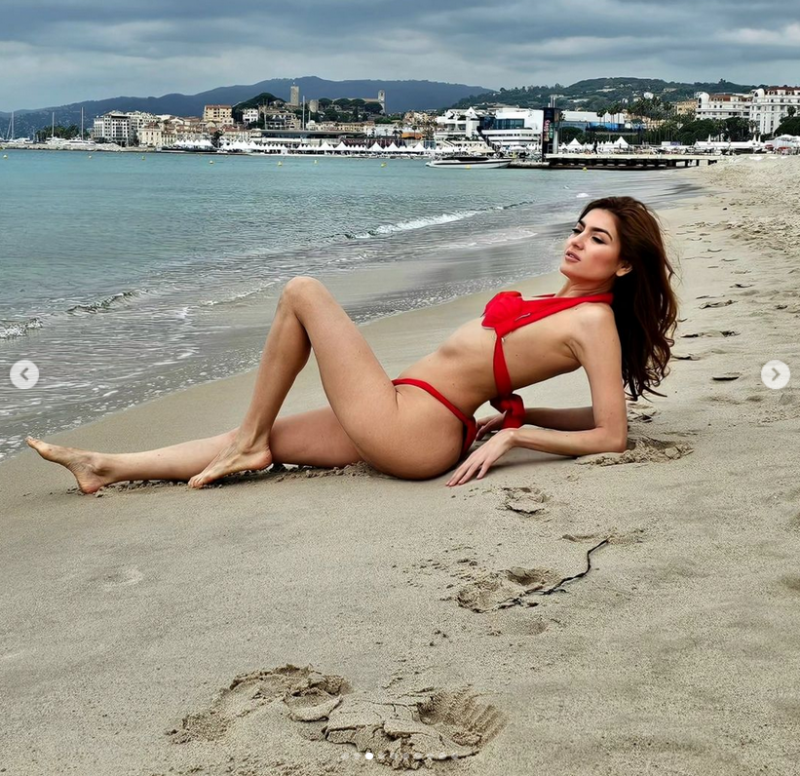 43-годишната Бланко позира на плажа край океана, облечена в бански в ярко-червен цвят. Тв звездата позира на пясъка с пусната коса, като е решила да не си поставя грим и бижута.