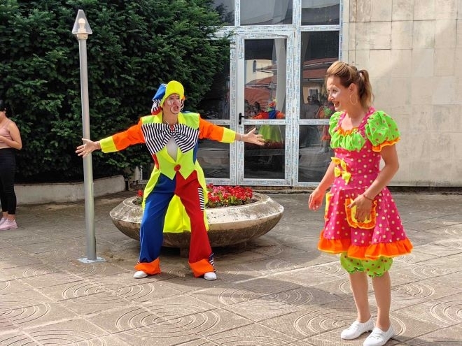 Клоуните Сиси и Вени забавляваха и веселиха малки и големи малчугани. И както е прието Сиси и Вени щедро раздадоха на всички деца награди, осигурени от Община Оряхово.