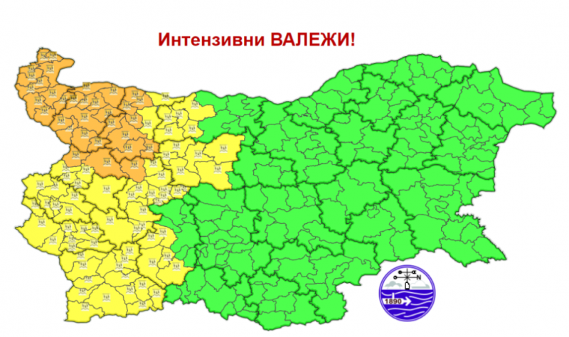 С предупредителен жълт код са маркирани областите Плевен, Ловеч, София, Кюстендил, Благоевград, Перник и Пазарджик.