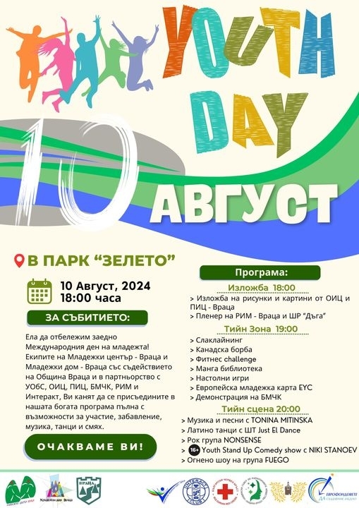 На 10 август /събота/ от 18:00 часа в парк "Зелето" екипите на Младежки център - Враца / Youth Center - Vratsa и Младежки дом - Враца, в партньорство с УОбС, Интеракт, ОИЦ, ПИЦ, РИМ и БМЧК ще отбележим Международния ден на младежта, който стана традиция да се чества в града под Околчица.