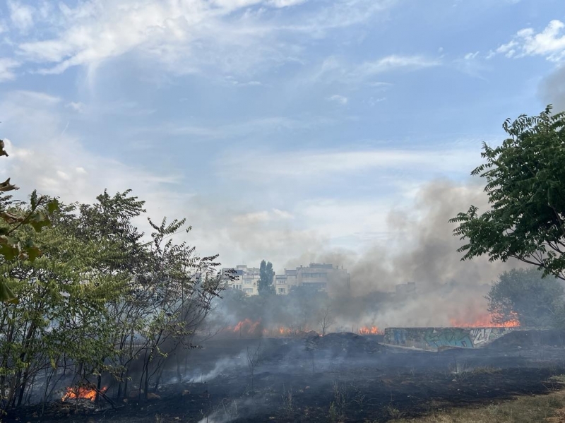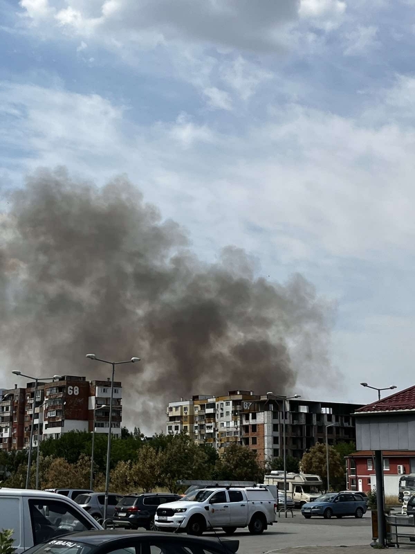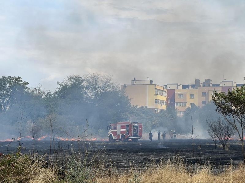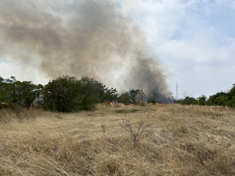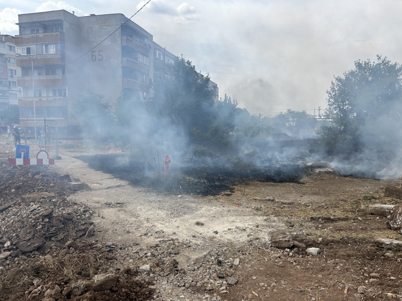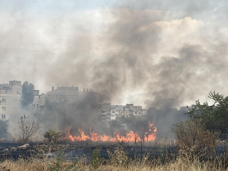 Пламъците са избухнали преди около 15 минути, но бързо се разпрострели и обхванали цялата тревна площ. Горят сухи треви и храсти, но огънят е в опасна близост до жилищния блок. Заради вятъра пламъците стават все по-големи.