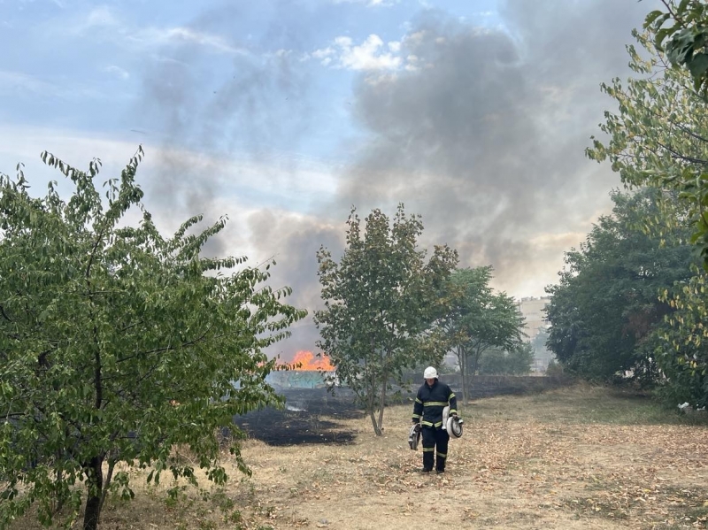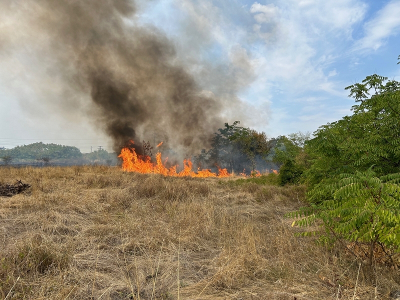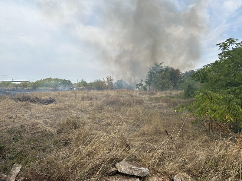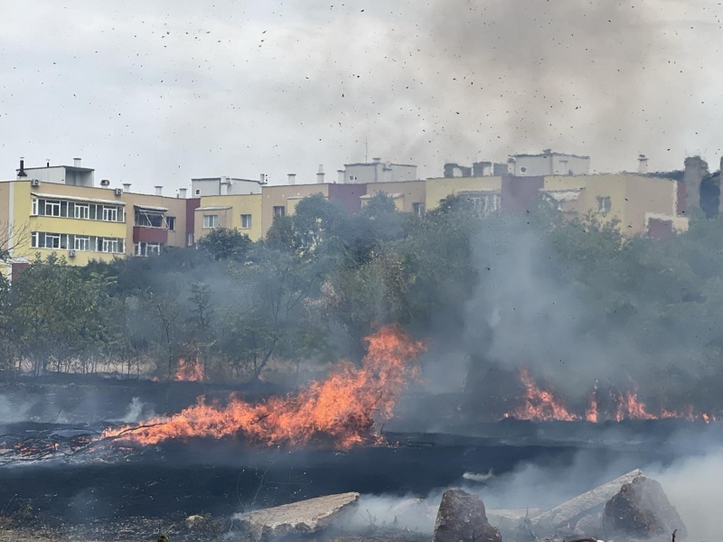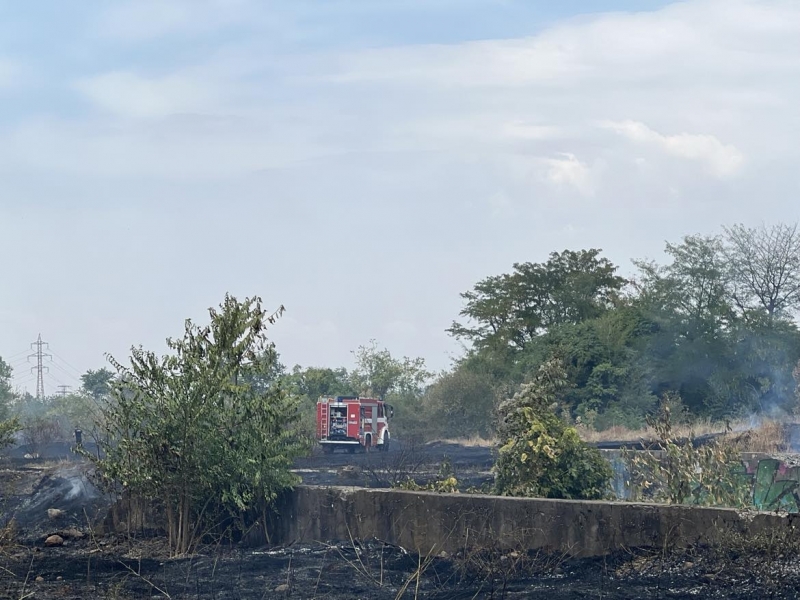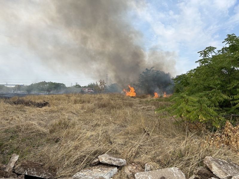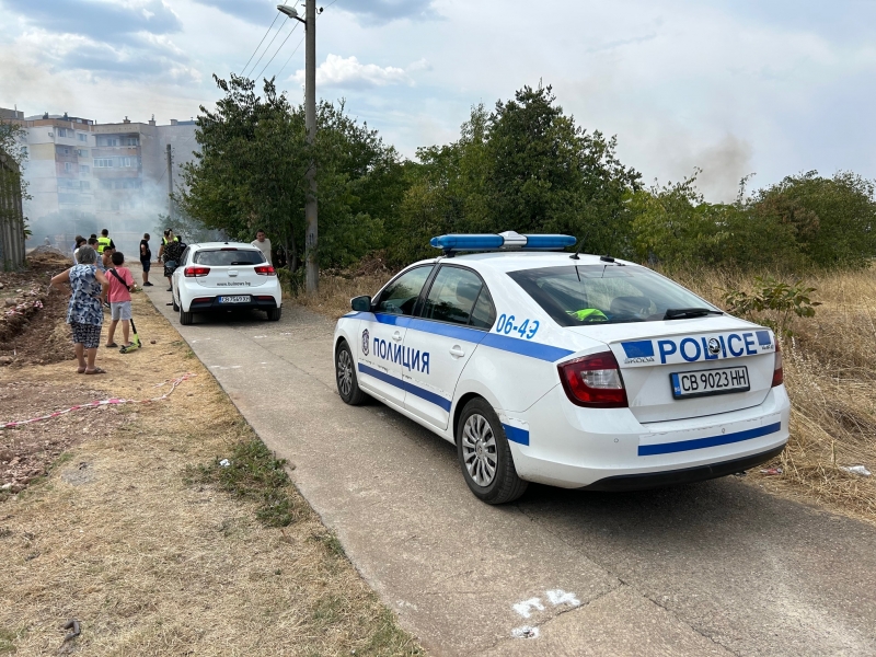 Пламъците са избухнали преди около 15 минути, но бързо се разпрострели и обхванали цялата тревна площ. Горят сухи треви и храсти, но огънят е в опасна близост до жилищния блок. Заради вятъра пламъците стават все по-големи.