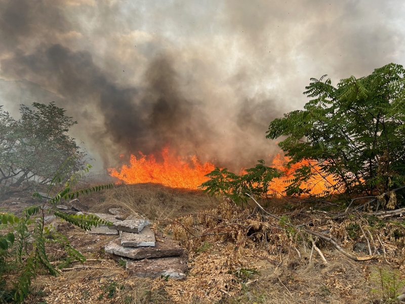 На метри от огъня се намира трафопост, като спасителните екипи се опитват да ограничат разпространяването на пламъците, за да не го обхванат и да нанесат още по-сериозни поражения.