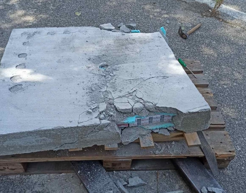 И друг необичаен опит за превоз на цигари с български акцизен бандерол е установен от митническите служители в същия ден. При проверка на автовоз, пътуващ за Германия, митническите инспектори проверяват непридружена пратка - бетонна плоча, за която водачът - български гражданин твърди, че е търговска мостра. Оказва се, че в бетона са отлети 5400 къса (270 кутии) цигари с български акцизен бандерол.