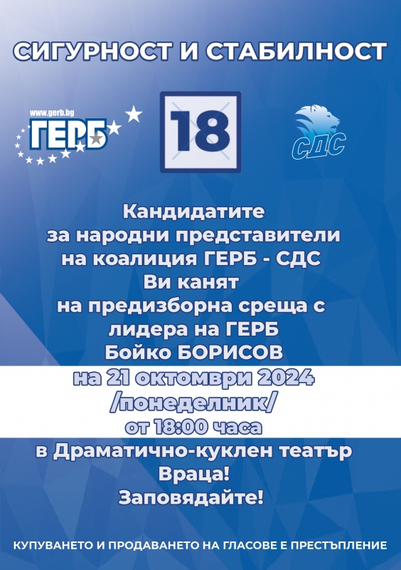 Водачът на листата и кандидатите за народни представители от ГЕРБ-СДС за област Враца ще проведат на 21 октомври 2024 г. от 18.00 ч. в Драматично-куклен театър - Враца политическото си събитие в предизборната кампания с лидера на ГЕРБ Бойко Борисов.