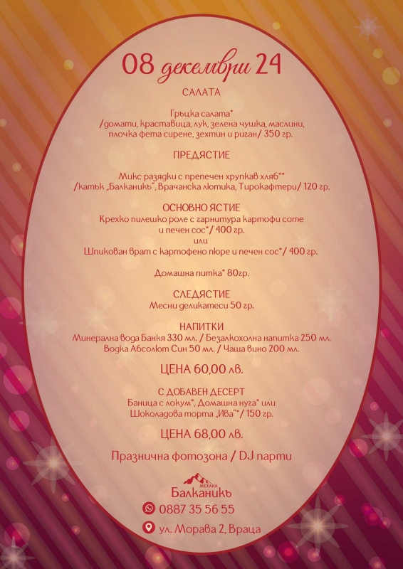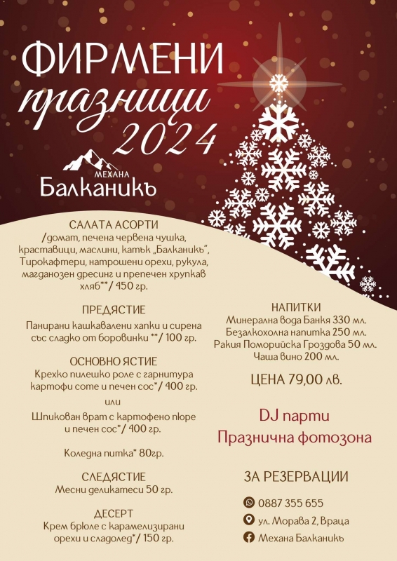 Заповядайте и изживейте магията на празничния сезон с механа „Балканикъ“! Направете резервация още сега на тел: 0887 355 655 и 0889 356 464.