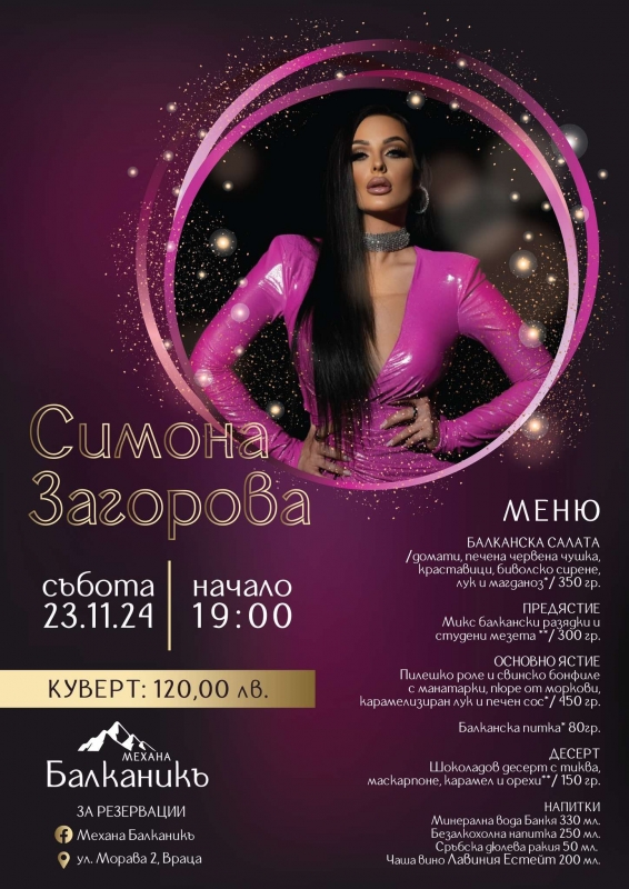 Празничният сезон в хитовото заведение обаче започва още този месец. На 23 ноември гост в „Балканикъ“ ще бъде обичаната изпълнителка Симона Загорова.