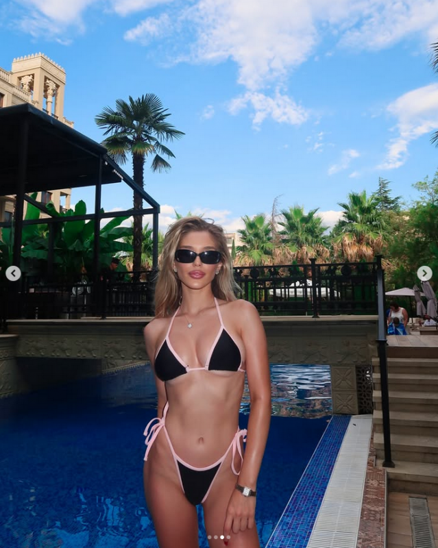 На кадрите красавицата позира с ефектен син бански, сламена шапка и бели очила, събирайки слънчеви лъчи около басейна. Блондинката се намира на поредната си почивка извън страната, като този път е в Египет.