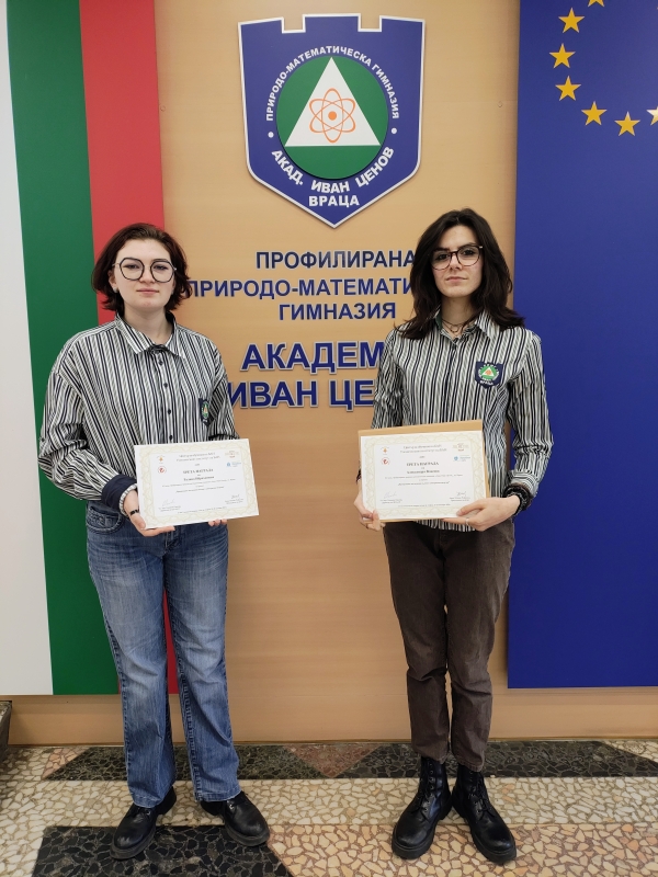 Александра Власова и Ралица Ибрахимова от XII б клас на профилираната природо-математическа гимназия във Враца бяха отличени с трета награда на Единадесетата научна сесия на Ученическия институт на БАН. Събитието се проведе на 23 и 24 ноември в гр. София.