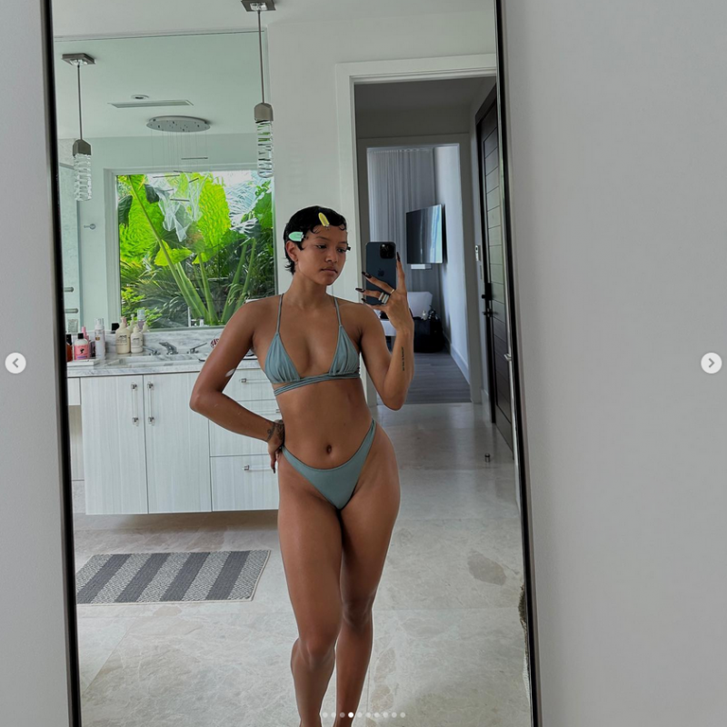 36-годишната звезда е заснета на почивка в Канкун, Мексико, където е наела къща на брега на океана. Актрисата от сериала "Нокти" се появява пред камерите в изрязани многоцветни бикини. Комплектът бански включва триъгълно горнище и прашки, които откриват задните части.