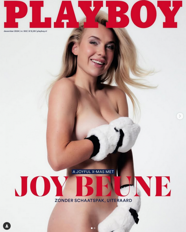 Холандката Джой Бьоне, която е световна шампионка по кънки на лед, украси корицата на декемврийското издание на популярното мъжко списание „Плейбой“ в родината си.