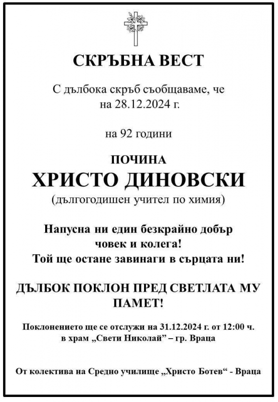 Вчера от този свят си е отишъл 92-годишният Христо Диновски. Той бе дългогодишен преподавател по химия, а новината за неговата кончина съобщиха от ръководството на СУ "Христо Ботев" във Враца.