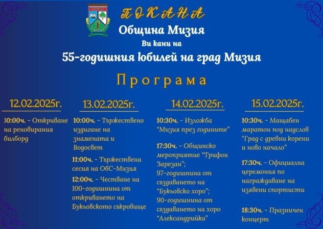 - 11.00 ч. – Тържествена сесия на ОбС-Мизия