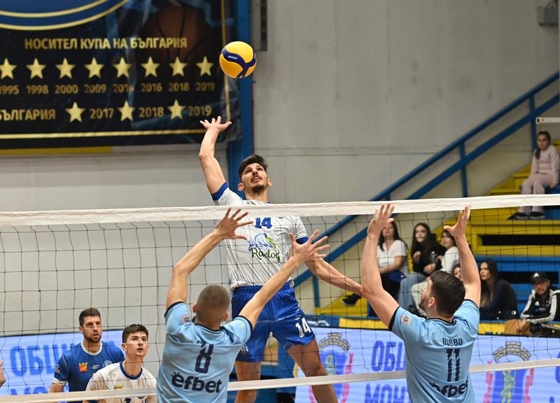 За "Пирин" Мартин Кръстев записа 13 точки (1 ас, 1 блок), Мариян Наков добави 9 т. (1 блок).