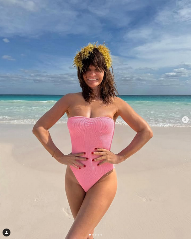 Супермоделът показа своята изящна фигура в розов бански без презрамки, докато позира на слънчев плаж.