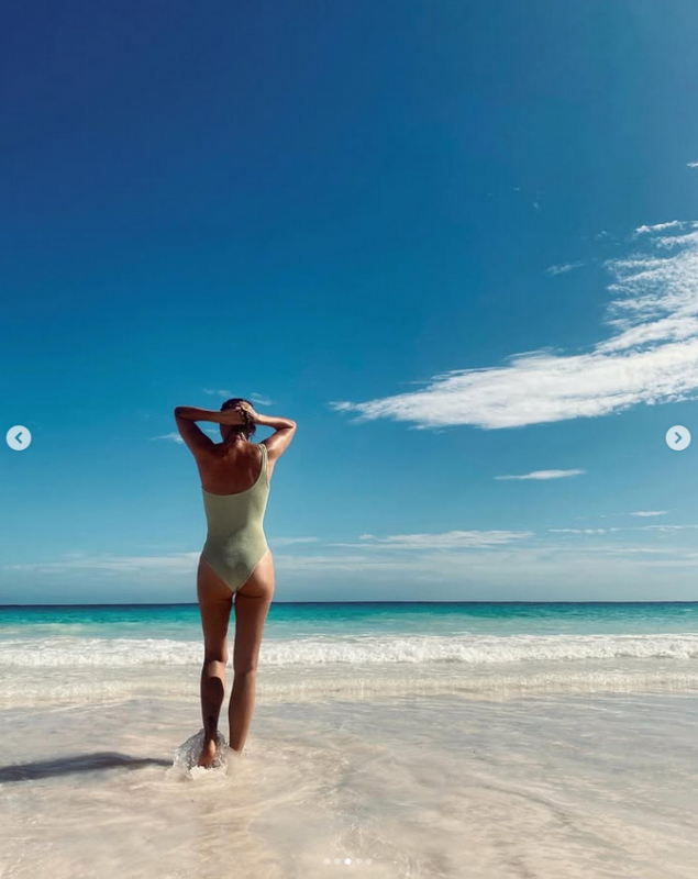 По време на разходката си до плажа тя затвърди статута си на супермодел, като си направи импровизирана корона от водорасли, която закачливо комбинира с банския си костюм.