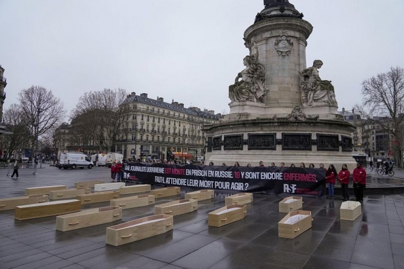 В центъра на Париж тази сутрин бяха поставени 20 ковчега, за да се напомни за съдбата на украинските журналисти, убити или хвърлени затвора в Русия, в навечерието на третата годишнина от руската инвазия в Украйна, предаде Франс прес.