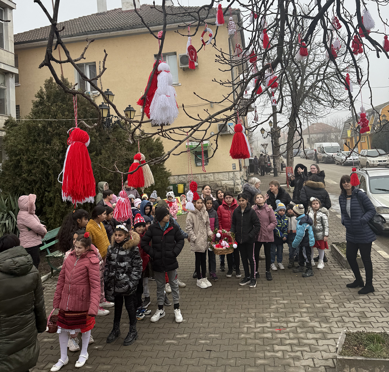 Децата помогнаха в украсяването с ръчно изработените от тях мартеници.
