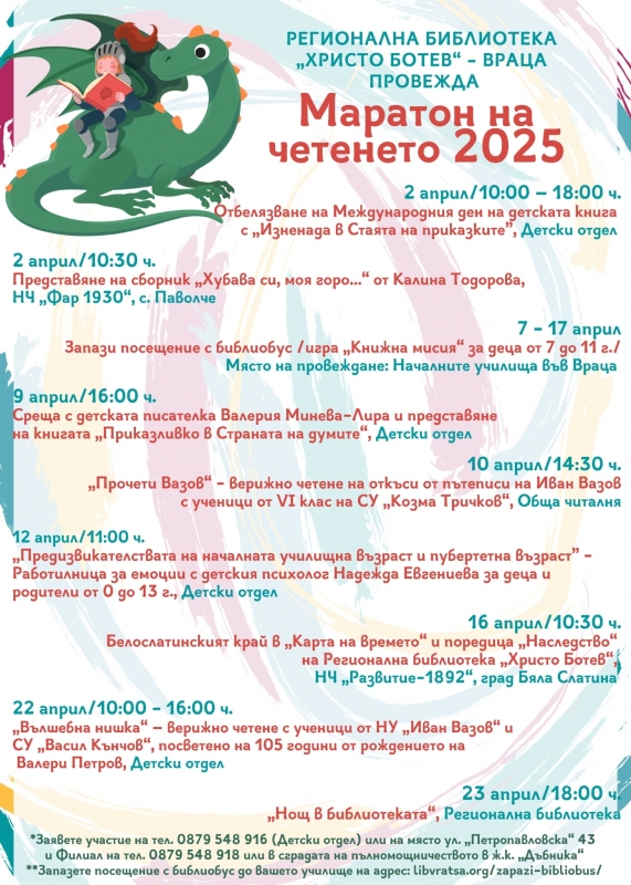 С изненади в Стаята на приказките ще започне Маратонът на четенето 2025, в който Регионална библиотека „Христо Ботев“ – Враца се включва за поредна година със серия от събития, в дните от 2 до 23 април.