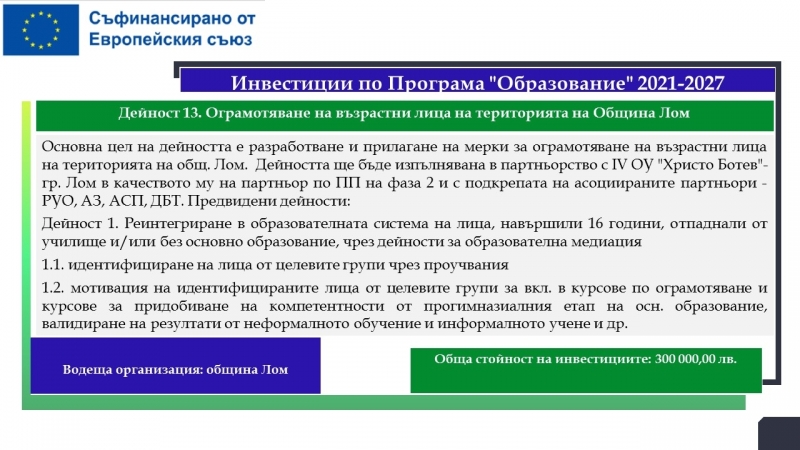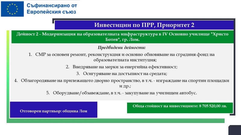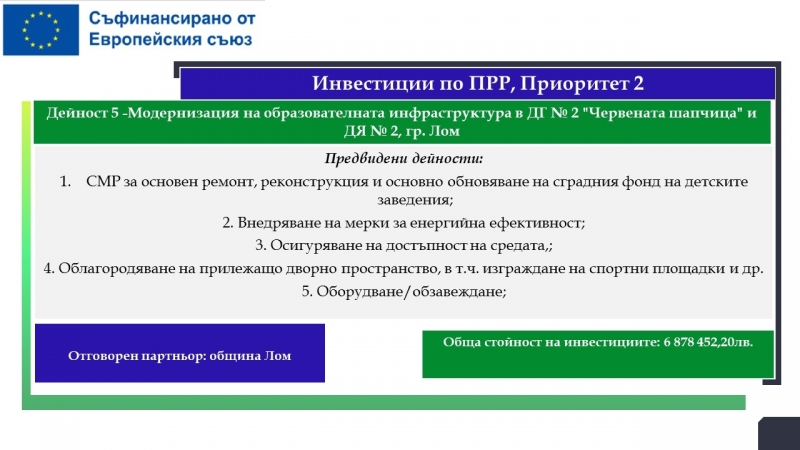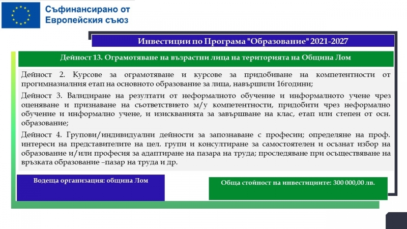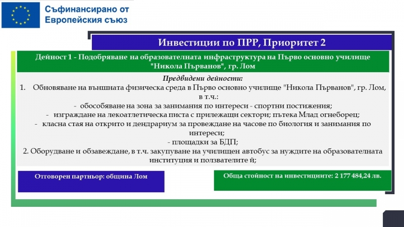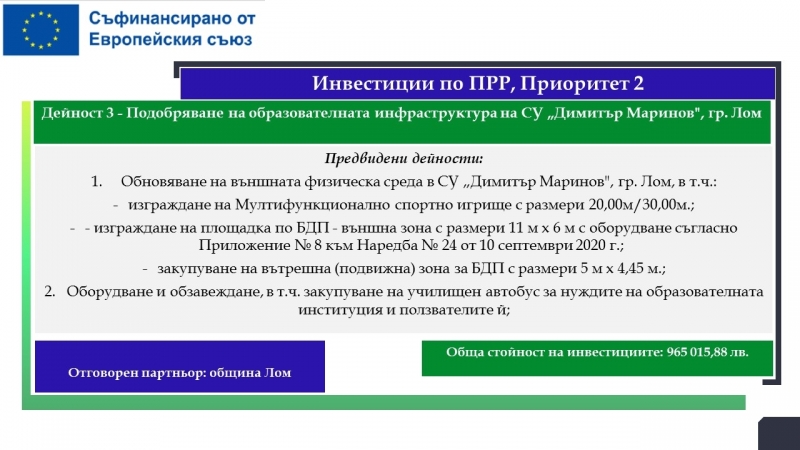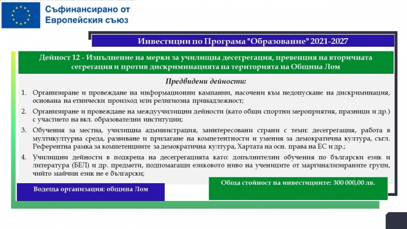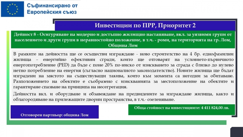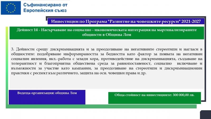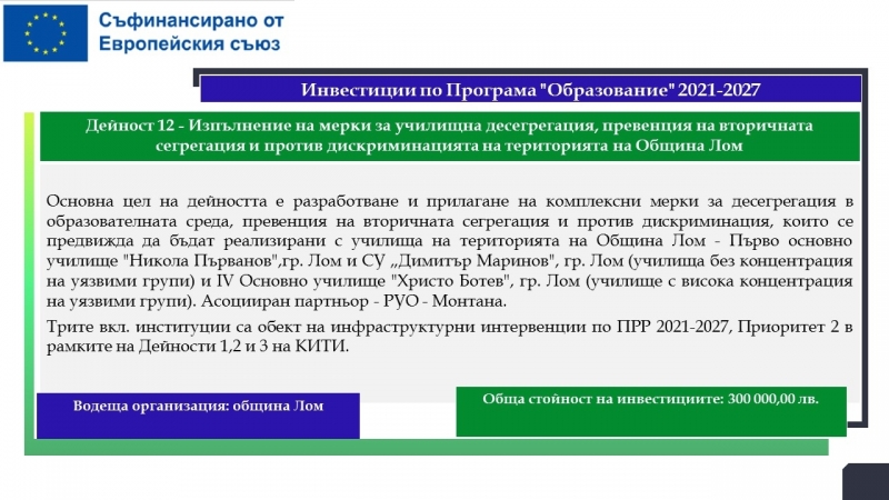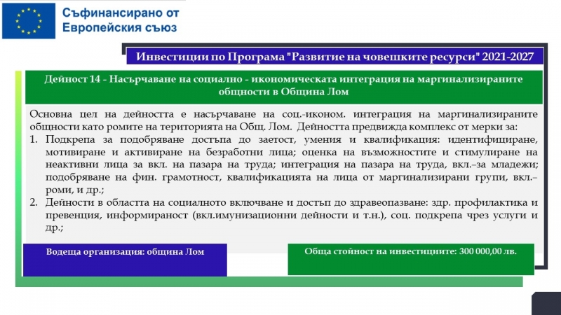 На територията на община Лом са планирани дейности за почти 33.5 милиона лева, свързани с подобряване на образователната инфраструктура на училища, детски градини и ясла, модернизиране на общинската болница с оборудване за диагностика на сърдечносъдови заболявания, осигуряване и оборудване на мобилен лекарски кабинет, изграждане на еднофамилни жилища. Предвидени са и мерки, насочени към училищната десегрегация, ограмотяването на възрастни лица и насърчаването на социално-икономическата интеграция на маргинализираните общности в общините Видин и Лом.