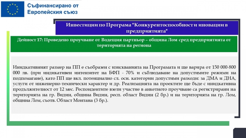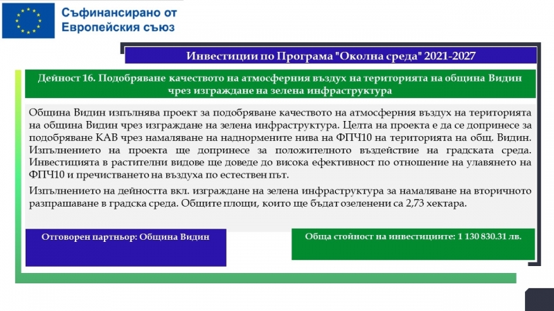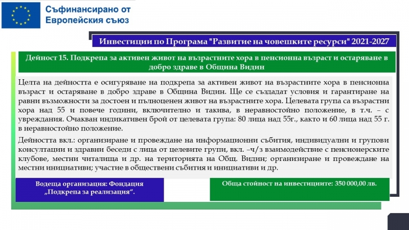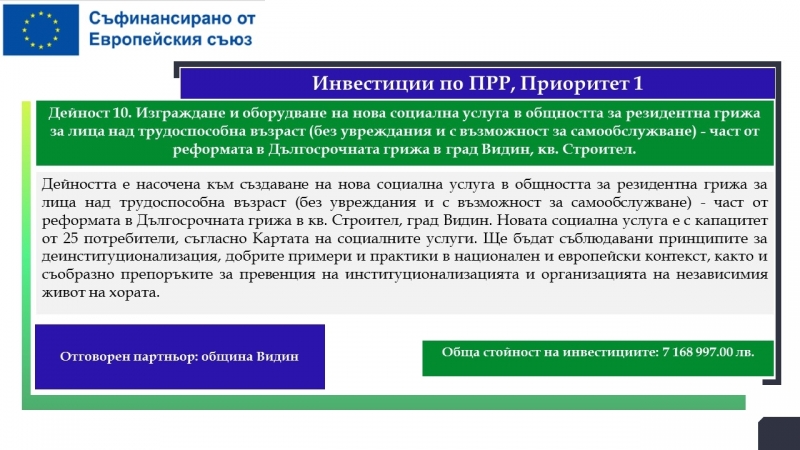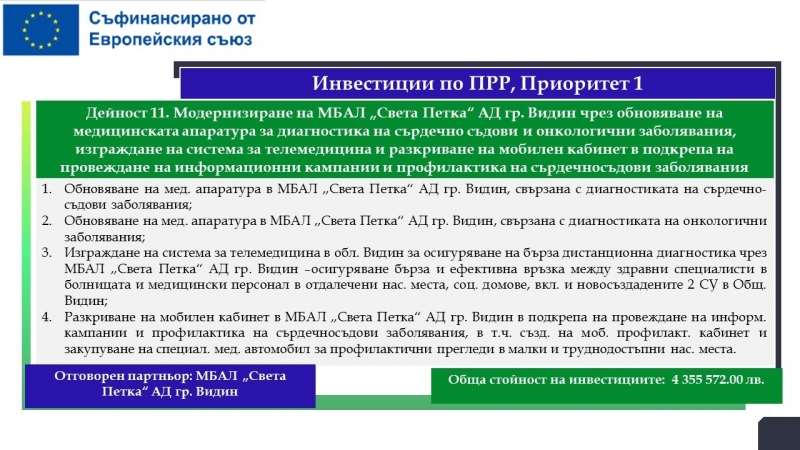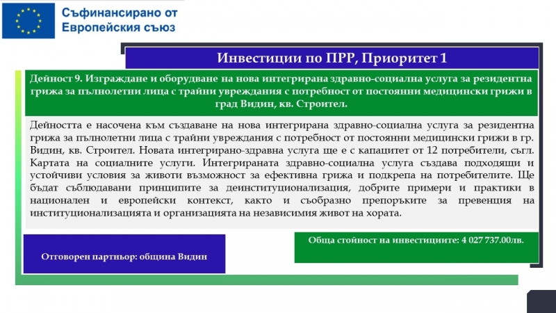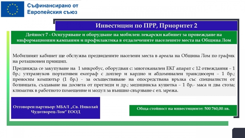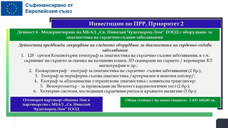 Водещ кандидат е Община Лом, а партньори са МБАЛ „Света Петка“ – Видин, МБАЛ „Свети Николай Чудотворец – Лом“, Община Видин и Фондация „Подкрепа за реализация“.