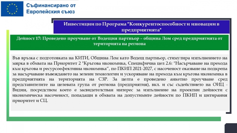 Целите и очакваните резултати от изпълнението на концепцията (КИТИ) бяха представени по време публичната дискусия в Лом, която се организира от Звеното за публични консултации към Регионалния съвет за развитие (РСР) на Северозападен регион, Община Лом и Община Видин. В обсъждането участваха кметът на Община Лом Цветан Петров, заместник-кметът на Община Видин Десислава Тодорова, заместник-кметът на Община Лом Теодора Каменова, управителят на МБАЛ „Св. Николай Чудотворец“ д-р Георги Савков, Мария Гергова – експерт „Проекти“ в МБАЛ „Света Петка“ – Видин, граждански сдружения и медии. Презентация на проектите направи Анна Йорданова, директор „Общинска собственост, обществени поръчки, инвестиционна политика и проекти“.