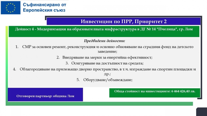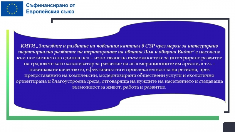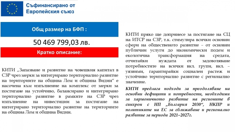 Модернизиране на инфраструктурата на училища и детски градини, изграждане на социални заведения, закупуване на съвременно медицинско оборудване за общинските болници в Лом и Видин предвижда Концепцията за интегрирани териториални инвестиции „Запазване и развитие на човешкия капитал в СЗР чрез мерки за интегрирано териториално развитие на териториите на община Лом и община Видин“.
