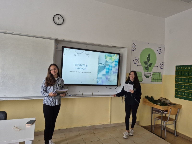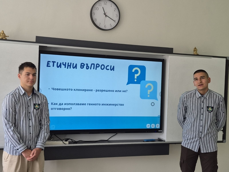 Тази година, учениците Теодора Камберова, Мартин Георгиев, Иванина Ивайлова и Виктория Камберова от 9 в клас, както и Борис Ангелов и Николай Николаев от 10 г клас, представиха впечатляващи презентации пред своите съученици. Темите на техните доклади обхващаха важни аспекти на съвременната наука, включително „Етиката в науката“, „Генни модификации“ и „Клониране и генно инженерство“. Подготовката на учениците беше ръководена от г-жа Величка Младенова, старши учител по биология и здравно образование.