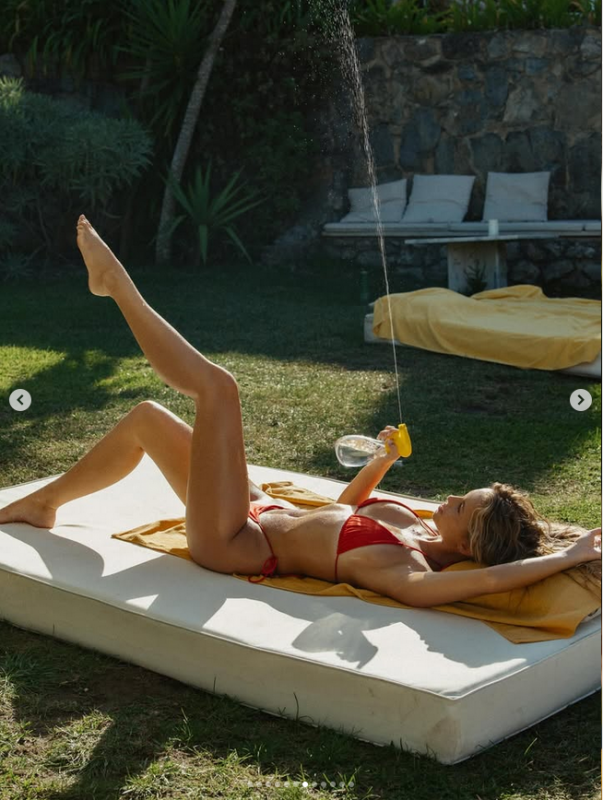 На един от фотосите Корсейро позира в огледало, демонстрирайки впечатляващата си фигура в стилен бял и кафяв бански.