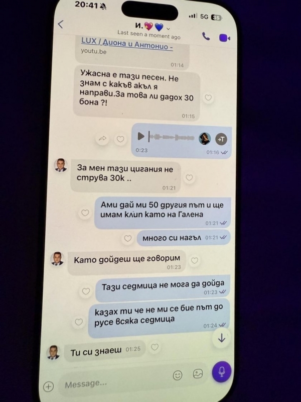 В друга част от кореспонденцията общинският съветник критикува клип на певицата с думите: „Ужасна е тази песен, не знам с какъв я направи. За това ли дадох 30 бона, за мен тая работа не струва 30к.“ Отговорът на Диона гласи: „Ами дай ми 50 другия път и ще имам клип като на Галена.“
