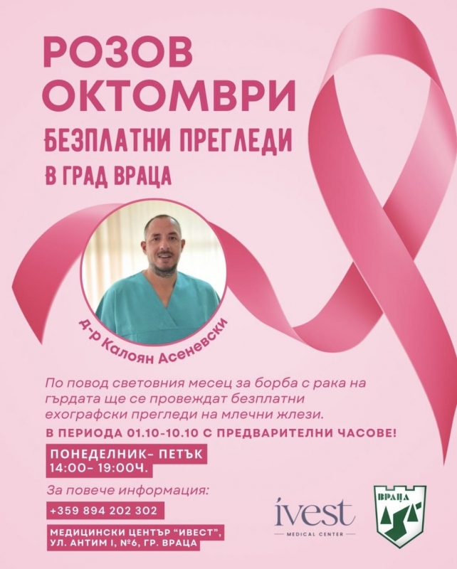 Консултациите ще се извършват от д-р Калоян Асеневски. Той ще прави ехографски прегледи прегледи на млечни жлези от 1 до 10 октомври. Желаещите да се възползват от безплатната консултация могат да го направят всеки делничен ден от 14 до 19 часа, в сградата на Медицински център „Ивест“ на ул. „Антим I“ №6.