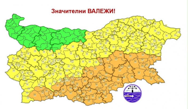 За цяла Южна България е в сила предупреждение от втора степен - оранжев код, за опасно време. В Западна, Централна Северна и Североизточна България в сила е предупреждение от първа степен - жълт код.