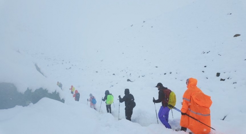 Водач описва снеговалежите като необичайно силни за това време на годината, докато спасителите водят туристите през виелиците около блокираните пътеки.