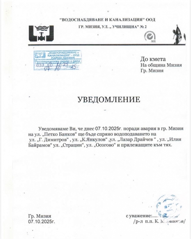„Водоснабдяване и канализация“ ООД в Мизия уведомява, че днес /07.10.2025 г./ поради авария в града на улица „Петко Банков“ ще бъде спряно водоподаването в други части от града.