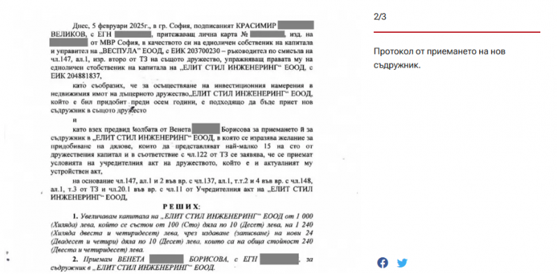 Според документите Венета Борисова е придобила дела във фирма “Елит стил инженеринг” на 5 февруари 2025 г. Дотогава фирмата е била 100% собственост на "Веспула" - еднолично дружество на Красимир Великов. С решение на едноличния собственик Великов капиталът на "Елит стил инженеринж" първо е увеличен от 1000 на 1240 лв., а после е приет нов съдружник - Венета Борисова, с дял във фирмата от 240 лв, пише Сега.