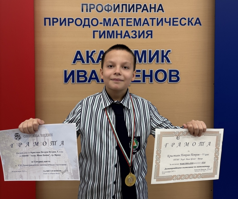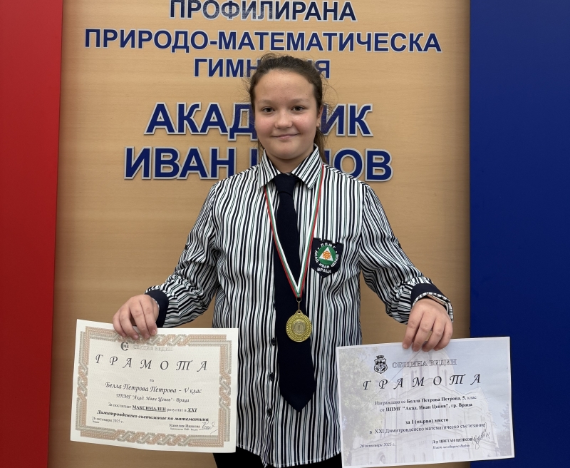 Кристиян Петров и Белла Петрова от V а клас на Профилираната природо-математическа гимназия спечелиха златни медали и грамоти, класирайки се на първо място с максимален брой точки на Димитровденското математическо състезание – 2025 г.