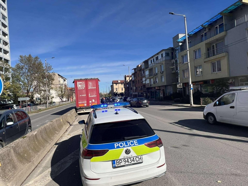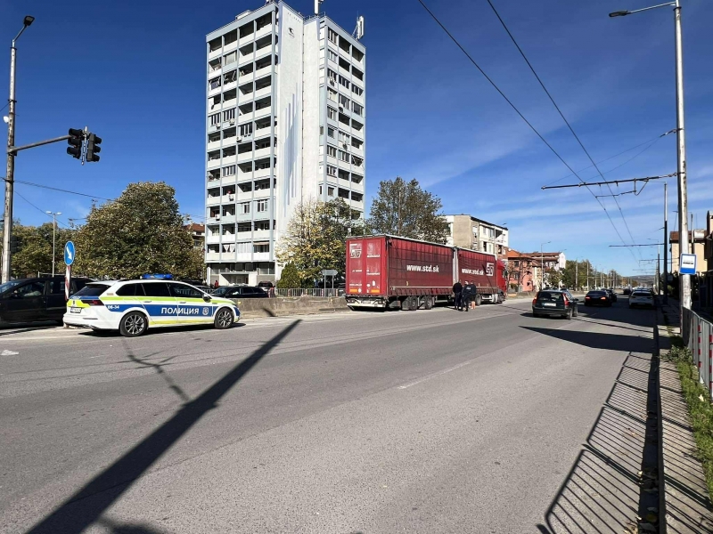 ТИР-ът заема лявата лента и затова движението по една от главните пътни артерии в града е затруднено. Съветваме водачите да карат с повишено внимание.