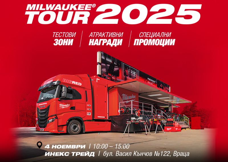 На 4 ноември, между 10 и 15 ч., във Враца ще спре най-очакваното събитие за всички професионалисти и почитатели на висококачествените инструменти – MILWAUKEE® TOUR! Домакин на събитието е „Инекс Трейд“, в магазина им на бул. „Васил Кънчов“ №122.