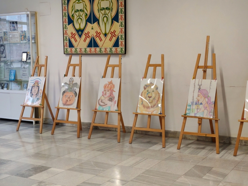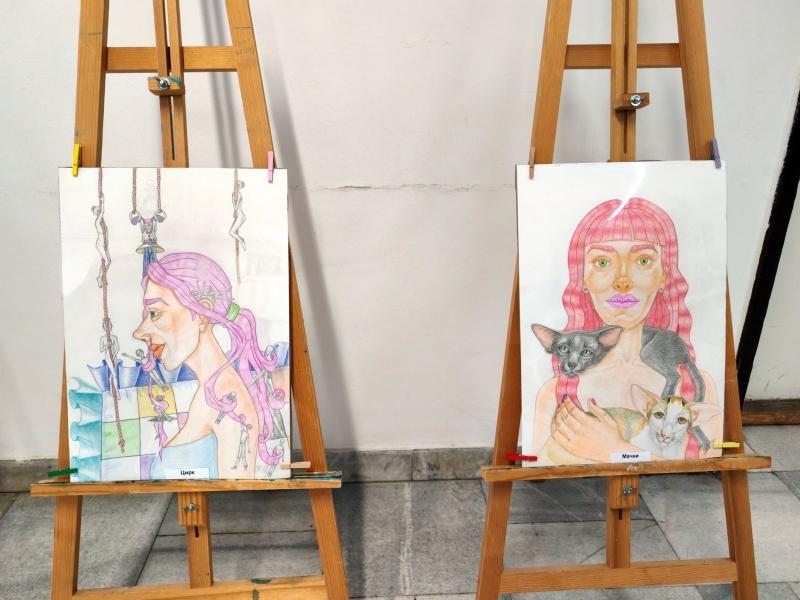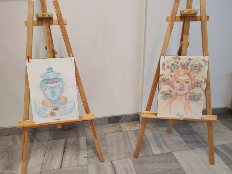 Експозицията включва 20 рисунки, изпълнени с цветни моливи върху картон: „Мухи“, „Народен дворец на културата“, „Мачки“, „Цирк“, „Лъв“, „Кокона“, „Хелоуин“, „Египет“, „Жената с котките“, „Жени“, „Дамата с лисиците“, „Жената с папагалите“, „Котаци“, „Жената с мопсчетата“, „Чаша кафе“, „Морско дъно“, „Есен“, „Море“, „Църквата „Св. София“ в Несебър“ и „Старият Несебър“.
