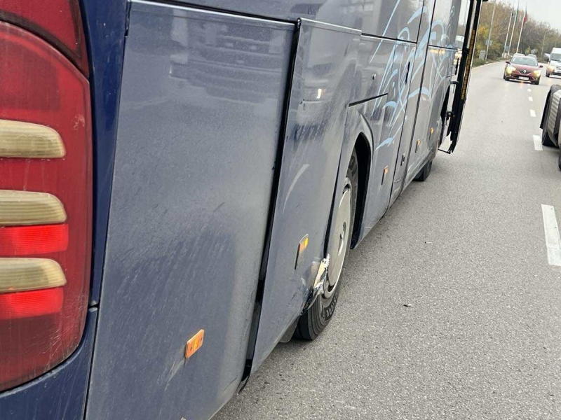 Колата е преместена от мястото на произшествието, за да не пречи на движението. Автобусът обаче все още е на шосето. Има и разпилени части по асфалта. Съветваме водачите да карат с повишено внимание.