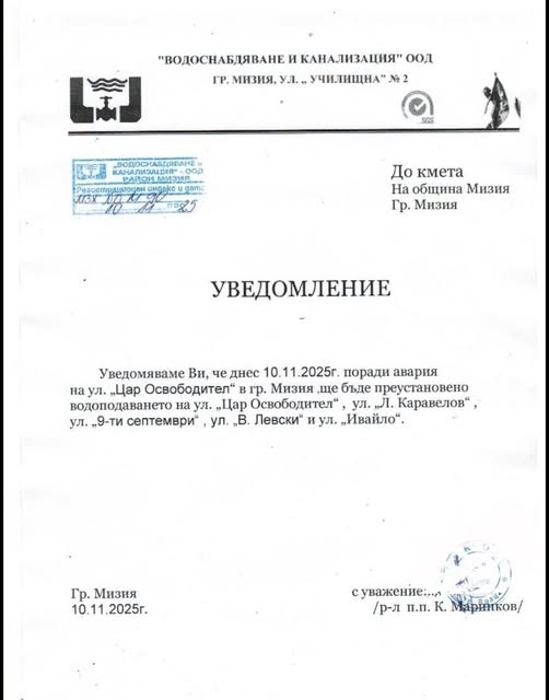 "Уведомяваме ви, че днес - 10 ноември, поради авария на ул. "Цар Освободител" в Мизия, ще бъде преустановено водоподаването на улиците "Цар Освободител", "Любен Каравелов", "9-и септември, "Васил Левски" и "Ивайло"."
