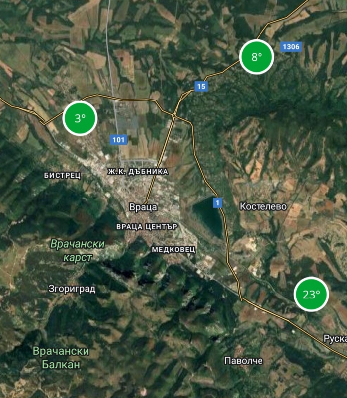 Излизайки от града в посока Мездра обаче температурите рязко се повишават. Данни на Meteo Bulgaria показват, че в село Руска бела в момента е цели 23°C.