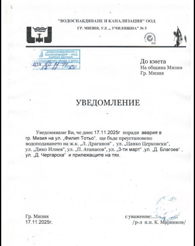 "Уведомяваме ви, че днес /17 ноември/ поради авария на ул. "Филип Тотьо" в Мизия, ще бъде преустановено водоподаването на ж.к. "Л. Драганов", ул. "Цанко Церковски", ул. "Дико Илиев", ул. "П. Атанасов", ул. "3-ти март", ул."Д. Благоев", ул. "Д. Чергарска" и прилежащите към тях".